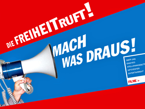 und dazu noch sämtliche Vorurteile gegen die Branche bekämpfen muss? Obwohl man doch hoch qualifizierte Jobs in allen Bereichen zu vergeben hat. Wir suchten nach der DNA des Unternehmens und wurden beim Gründer findig. Seine und unsere Botschaft- die Freiheit ruft. Wir entwickelten dazu ein überraschendes Kommunikationskonzept, das in der Öffentlichkeit mit intensiver hochkarätiger PR- Arbeit Vorurteile abbaut, das Mitarbeiter mit Freiheitsfibel und -film motiviert, Interessenten mit Online- Freiheits- Spielen fasziniert, high Potentials mit kleinen Fluchthelfern und Guerillaaktionen Anreiz gibt, ihre jetzige Situation zu überdenken und wo in bürokratiefreien Bewerbungssituationen jeder zeigen kann, was er kann, wenn er denn die Freiheit hat.